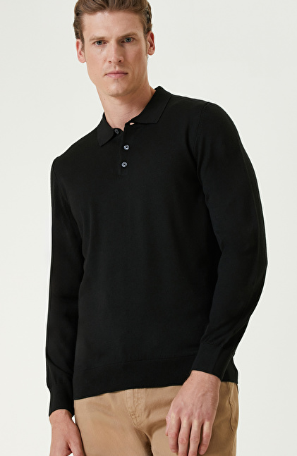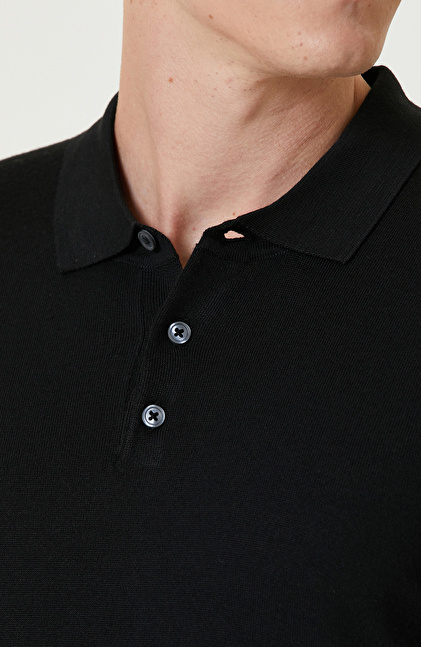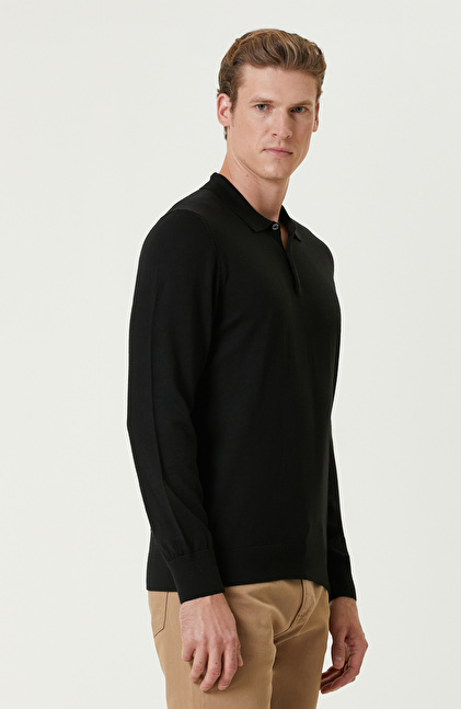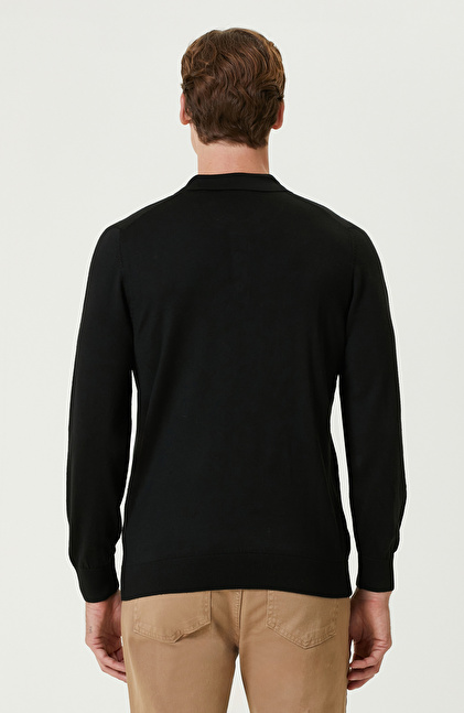 Siyah Polo Yaka Yün Karışımlı Triko Kazak
