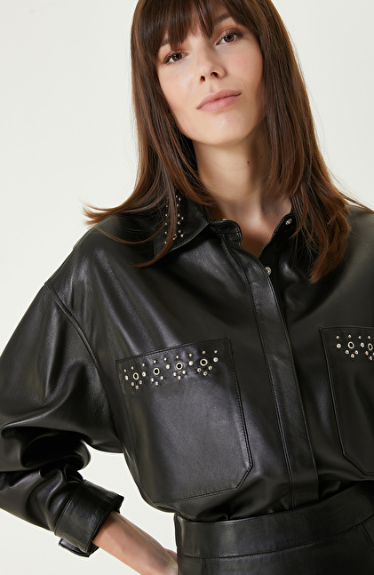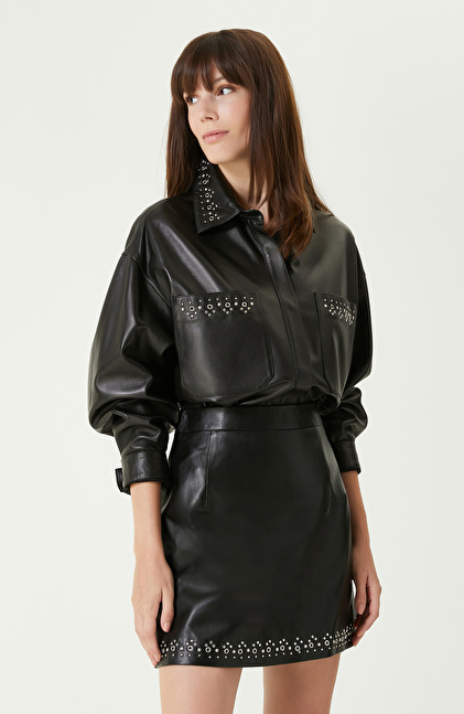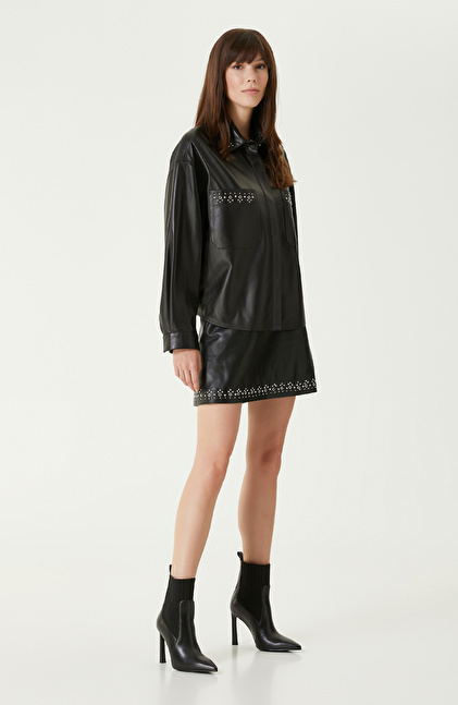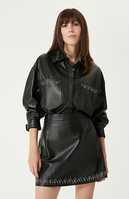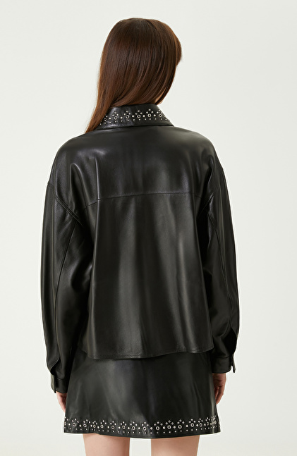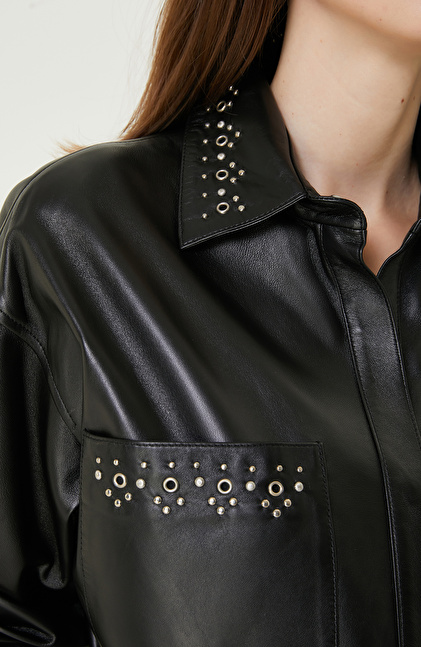 Siyah Trok Detaylı Deri Gömlek