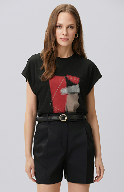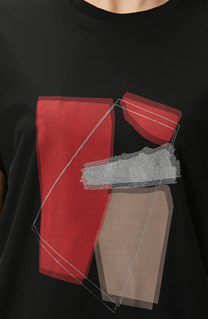NETWORK Siyah Tül Garnili Baskılı T-shirt