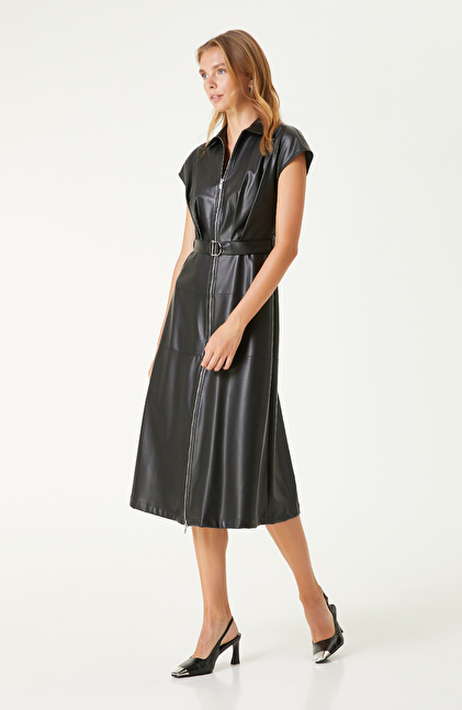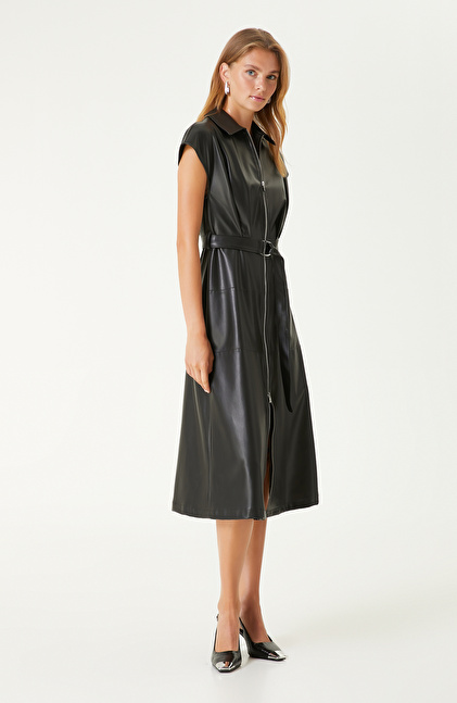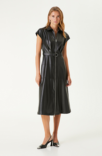 Regular Fit; Mid Boy; Suni Deri Elbise; Boydan Fermuarlı; Düşük Kollu
