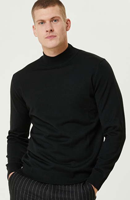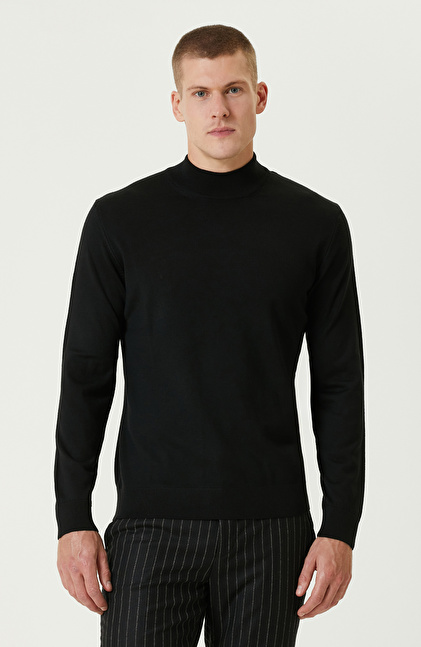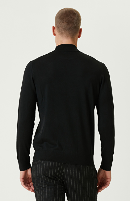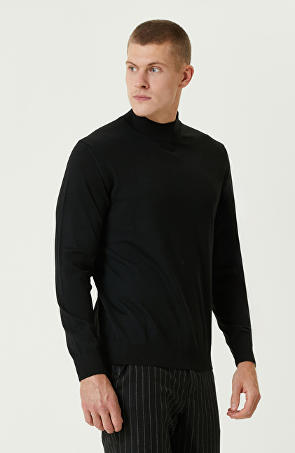 Siyah Yarım Balıkçı Yün Karışımlı Triko Kazak