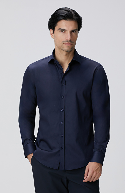 Slim Fit Lacivert Pamuk Saten Gömlek