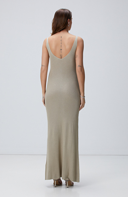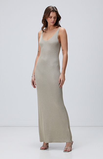 Slim Fit; V Yaka; Askılı; Maksi Boy; Triko Abiye Elbise; Taş Baskılı