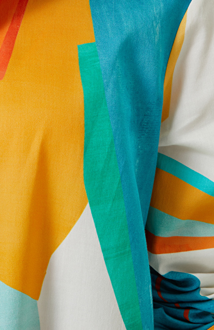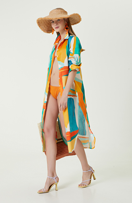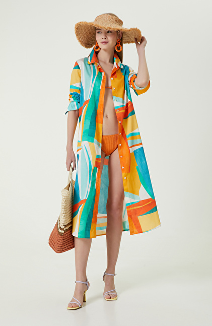 Yeniliklere açık ve stil sahibi kadınların tercihi Turkuaz Desenli Gömlek Yaka Elbise, NetWork Beach Wear tasarımları arasında yer alır. Sun Catchers serisinin önemli bir parçası olan plaj elbisesi, turkuaz, sarı, turuncu ve beyaz rengiyle yaz enerjisini yansıtır. Midi boyu sayesinde plajda konforlu vakit geçirmenizi sağlayan elbise, pareo gibi bikini ve mayoların üzerine de giyilebilir. Gömlek yaka stili ise sahilde şık kombinler yapmanızı destekleyen detaylardan biridir. Yırtmaçlı detaylı eteği, rahat yürümeniz için idealdir. Elbise boydan boya düğmeli olduğu için açık kapalı kullanıma uygundur. Turkuaz elbiseyi, ekru bikini, fuşya terlik, hasır plaj çantası ve şapkalarla kombinleyebilirsiniz.