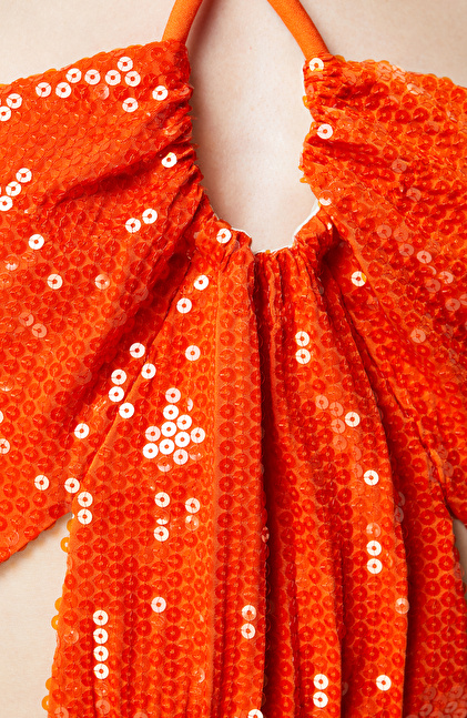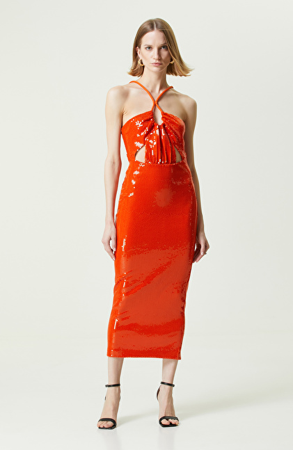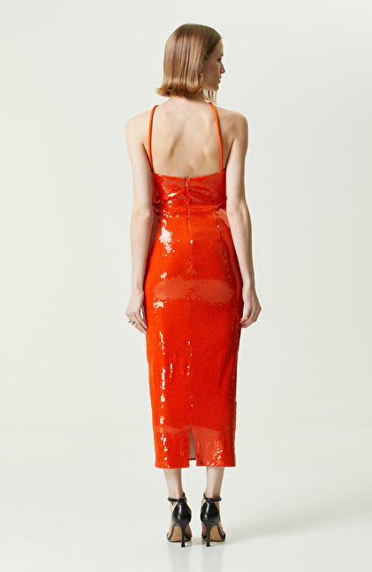 Turuncu Straplez Midi Abiye Elbise