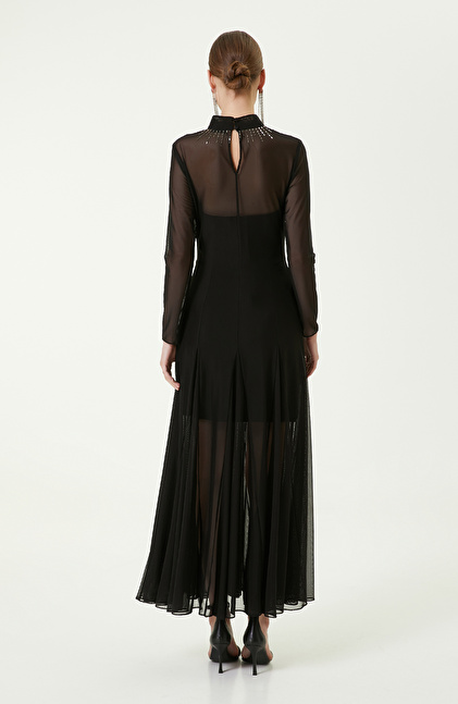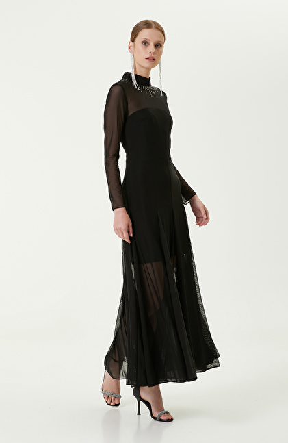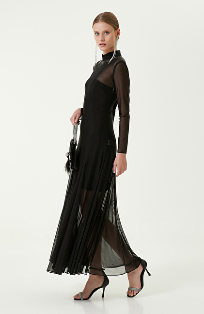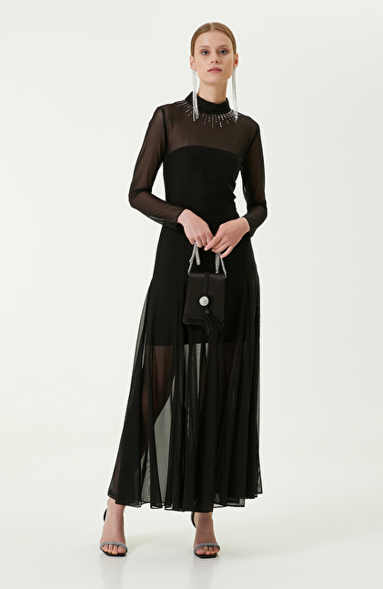 NetWork'ün zamansız ve zarif kadınlar için tasarladığı Dik Yaka Uzun Kollu Siyah Abiye Elbise, Black koleksiyonunun Secret Society serisinin gözde parçaları arasında yer alır. Boyun kısmında elbiseyi daha hareketli hale getiren aksesuar bulunur. Özel davetler için ideal tasarıma sahip elbise, göğüs ve bel kısmında vücuda otururken etek kısmı godeli dizaynı sayesinde daha geniştir. Transparan uzun kol ve dik yaka tasarımı sayesinde feminen ve çekici kombinler için rahatlıkla tercih edilebilir. Siz de abiye elbiseyi; kırmızı rugan stiletto, siyah deri mont, kırmızı el çantası ve gümüş-taşlı takılarla kombinleyebilir, çekici kış stilinizi sade ve şık bir şekilde öne çıkarabilirsiniz.