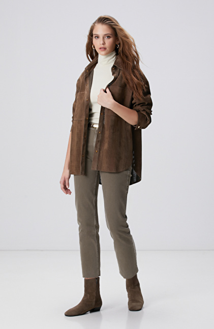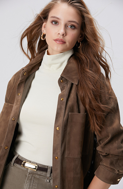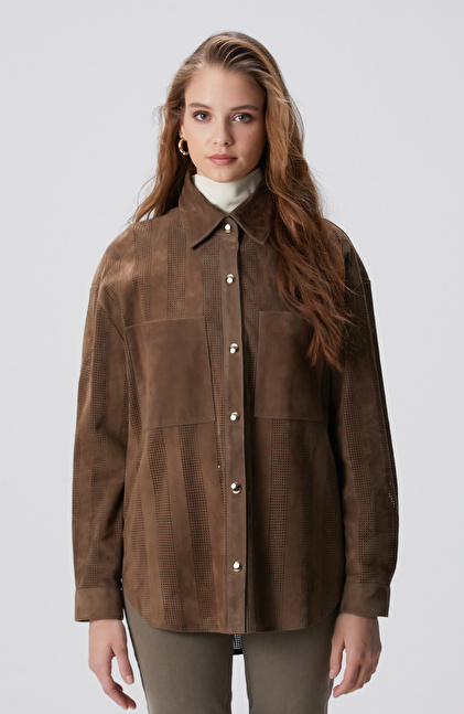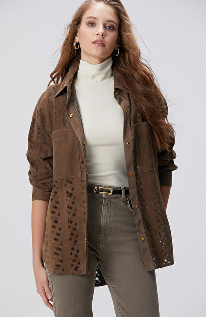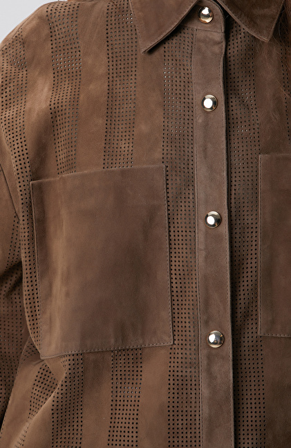 Regular Fit; Gömlek Yaka; Uzun Kol; Süet Deri Gömlek; Perforeli;Hayvansal Kökenli Tekstil Dışı Parçalar İçerir.