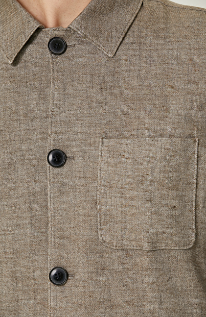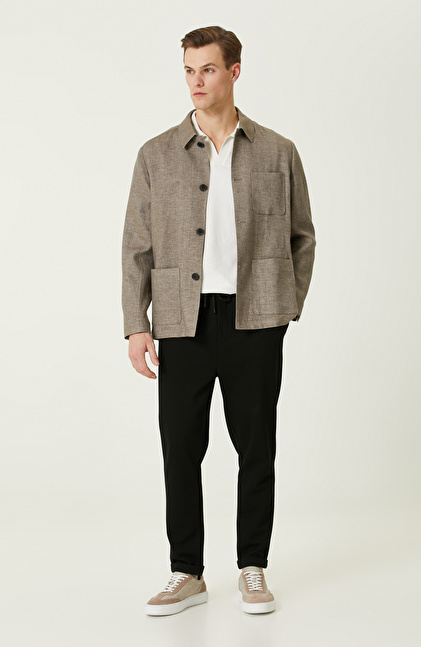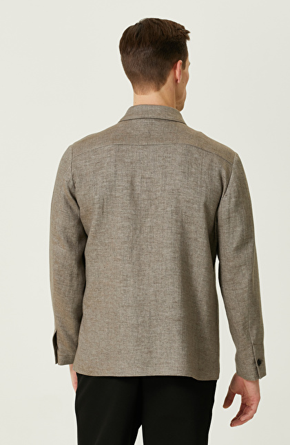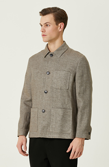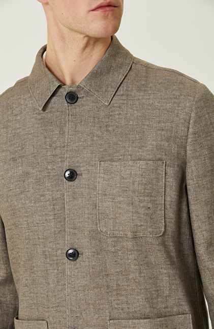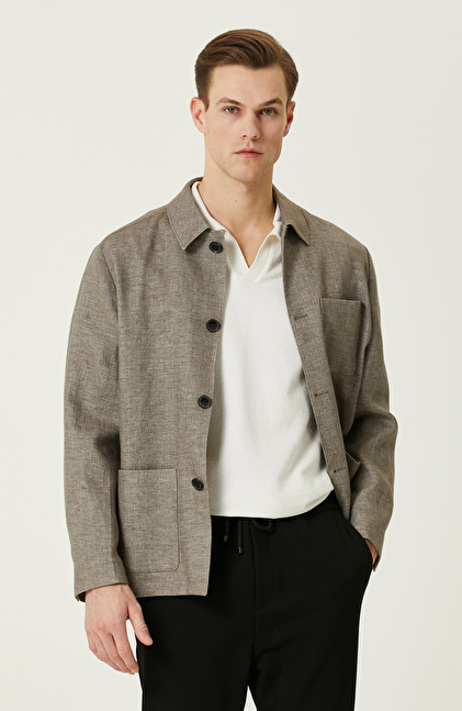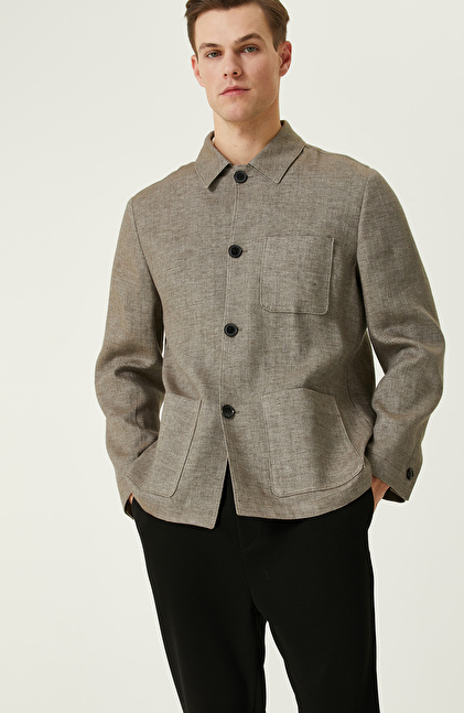 Comfort Fit; Gömlek Yaka; Uzun Kol; Dokuma Ceket; Keten Karışımlı; Düz Renk; Aplike Cepli