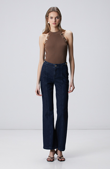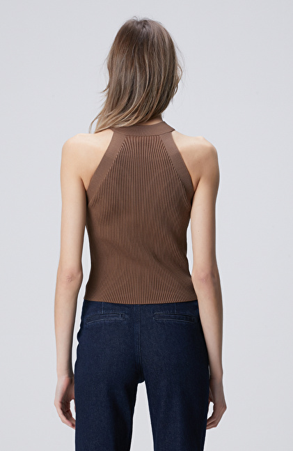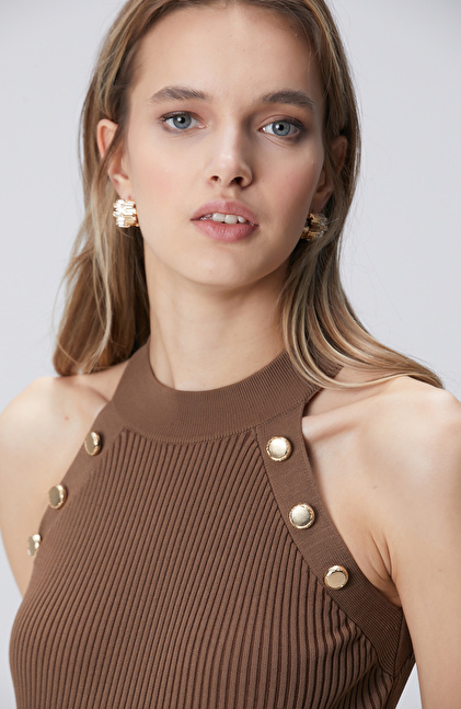 Slim Fit; Halter Yaka, Düğme Detaylı, Triko Atlet
