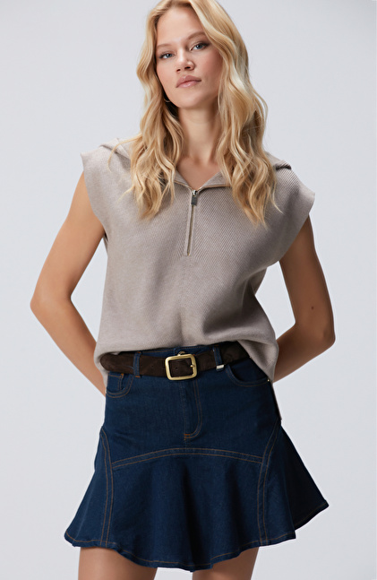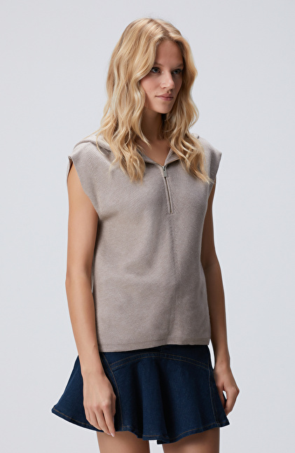 Basic Fit; Kapüşonlu; Yarım Fermuarlı; Verev Desenli; Kolsuz Kazak