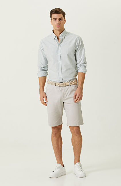 NetWork'ün ilham veren Desk serisinde yer alan Yeşil-Beyaz Çizgili Uzun Kollu Comfort Fit Gömlek, erkek yaz koleksiyonunun zamansız parçaları arasındadır. Comfort fit kalıbı ve alttan biritli detayı ile dinamik bir görünüm sunduğundan casual kombinler için idealdir. Tamamen pamuktan üretildiği için sıcak yaz aylarında konforlu bir kullanım sağlayan dokuma gömlek, çizgili tasarımı sayesinde çok sayıda alt giyim ürünü ile eşleştirilerek kullanılabilir. Siz de şehirli erkeğin tarzını yansıtan bu gömleği ekru ya da lacivert casual pantolonlar ve loafer modelleriyle eşleştirerek kullanabilir, çeşitli aksesuarlar ile destekleyerek sofistike bir görünüm elde edebilirsiniz.