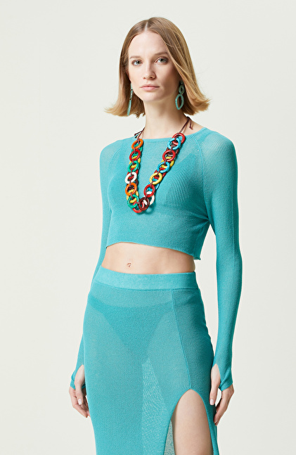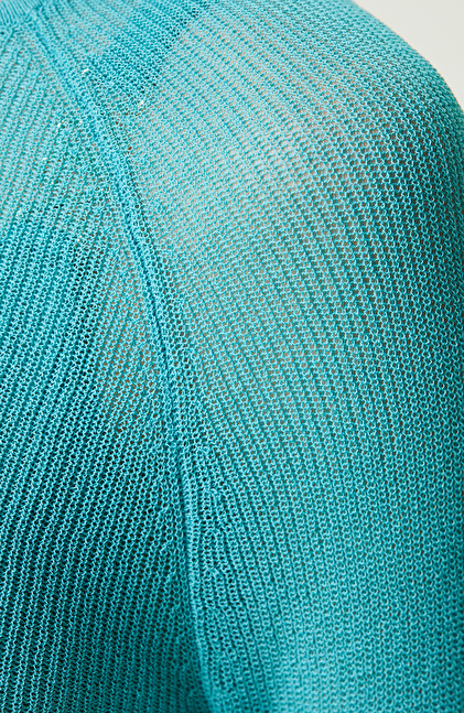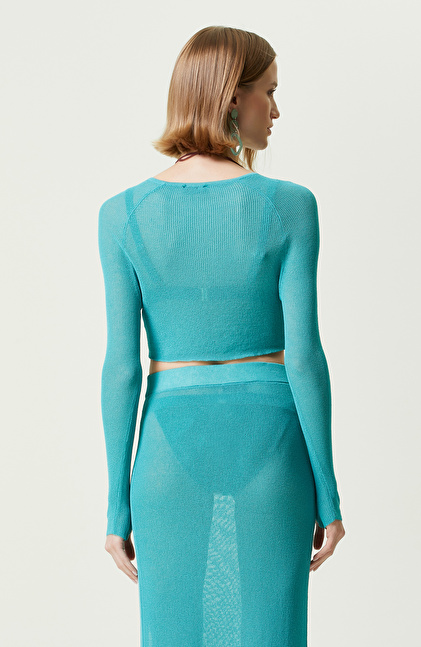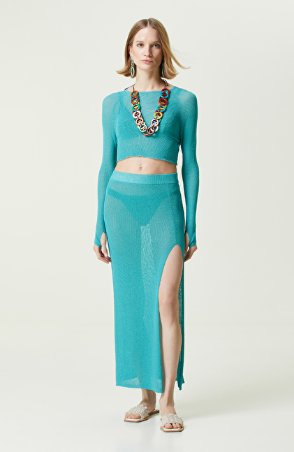 NetWork'ün yaratıcı ve dinamik çizgisini yansıtan Yeşil Bisiklet Yaka Plaj Bluz, Sun Catchers serisinin dikkat çekici parçaları arasındadır. Feminen stilini plajlarda da sürdüren kadınların tercihi yeşil bluz, rengarenk kombinlere ilham veren tasarıma sahiptir. Triko formu, esnek yapısı sayesinde vücudu sarar ve fit görünüm oluşturur. Hafif transparan plaj bluz, uzun kolludur ve kol ağızları parmak detaylıdır. Transparan yapısı sayesinde bikinilerinizi rahatlıkla eleştirebilirsiniz. Parmak geçmeli tasarımı ise sahil kombinlerine benzersiz bir detay ekler ve çekici görünmenize yardımcı olur. Bisiklet yaka bluzu, yeşil etek, kırımızı sandalet, kırmızı çerçeveli güneş gözlüğü ve dikkat çekici takılarla kombinleyebilirsiniz.