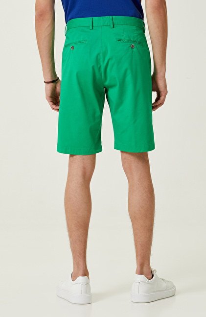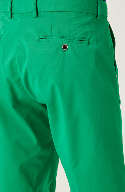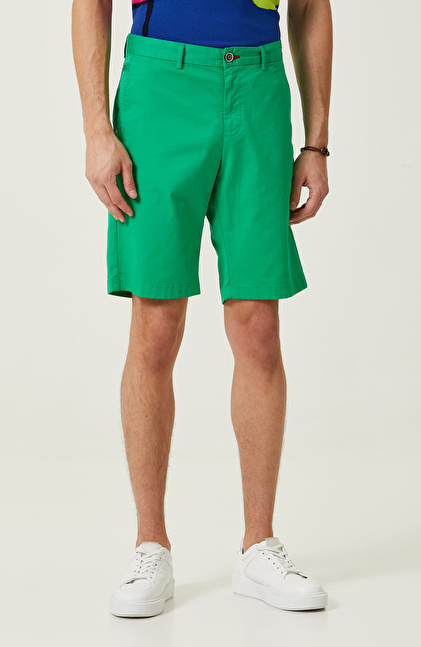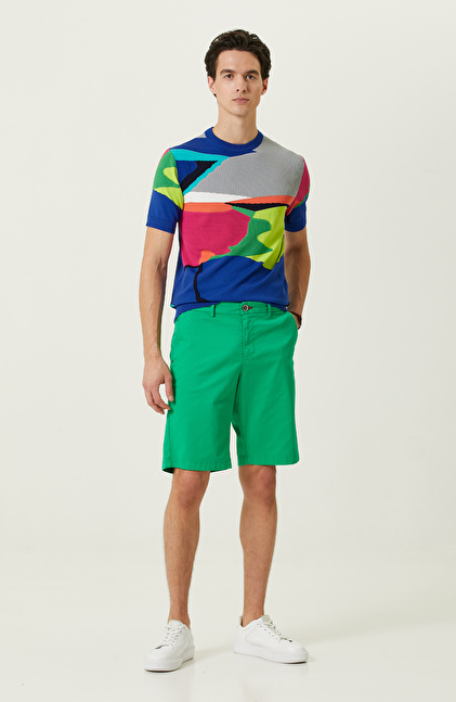 Beach Wear stilindeki Yeşil Duble Paça Slim Fit Şort, canlı tonuyla metropolde yaşayan erkeklerin dinamik stilini yansıtır. İlham veren NetWork Casual çizgisindeki model, fonksiyonelliğiyle sosyal hayatta aktif olan erkekler için iyi bir seçenektir. Yüksek kaliteli kumaşıyla rahatlık sunarken üst segment duruşu sayesinde şehirli yapıyı ortaya çıkarır. İlkbahar dönemlerinde kombinlerinize cesur bir görünüm kazandırır. Yan cepleri duble paçayla bir araya getirerek kombinlerin hem konforlu hem de şık olmasını sağlar. Yeşil şortu lacivert ağırlıklı renkli tişörtlerle kombinleyerek canlı görünümünü ortaya çıkarabilir, beyaz spor ayakkabılarla eşsiz bir şekilde stilinizi yansıtabilirsiniz.