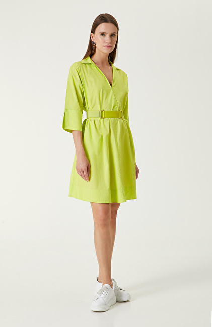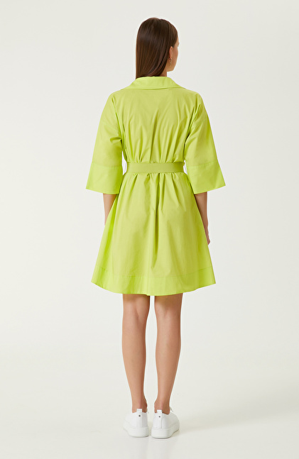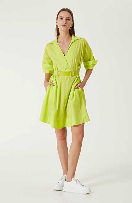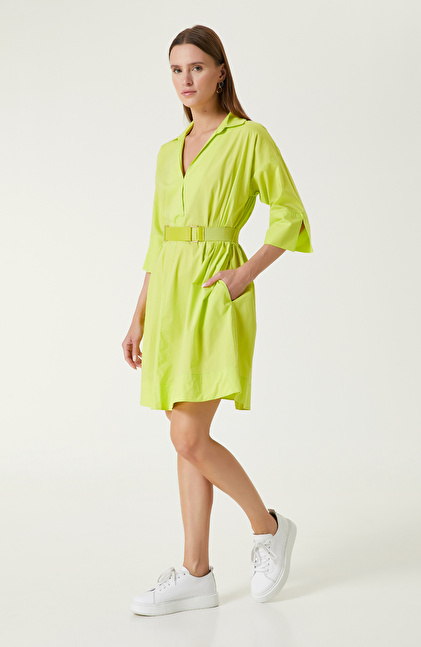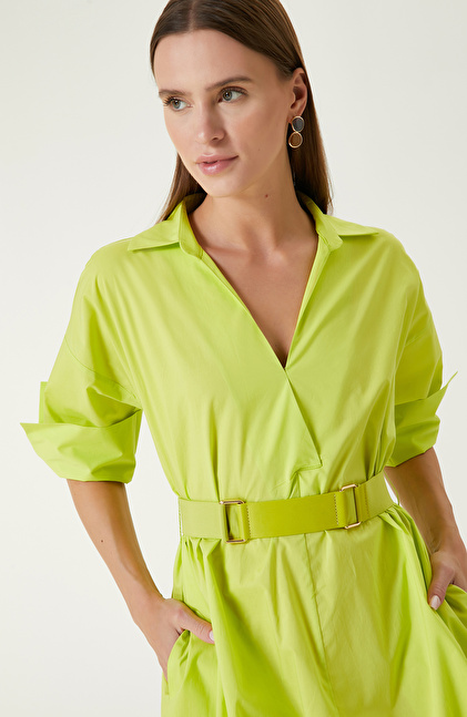 Regular Fit; Gömlek Yaka; Beli Kemerli; Midi Elbise