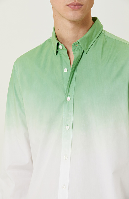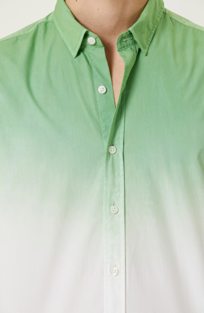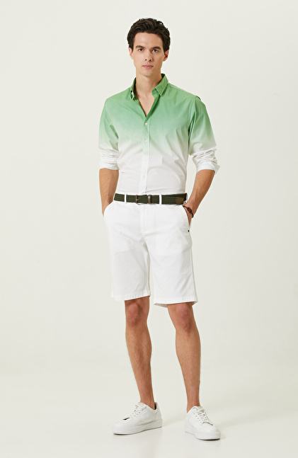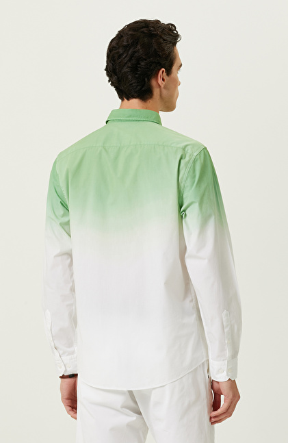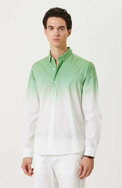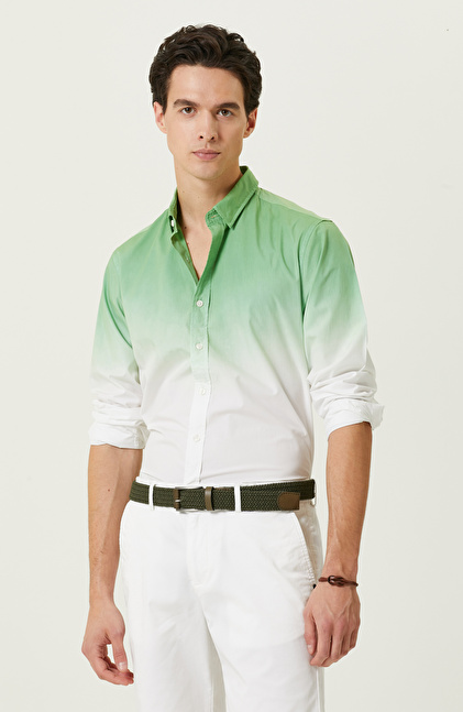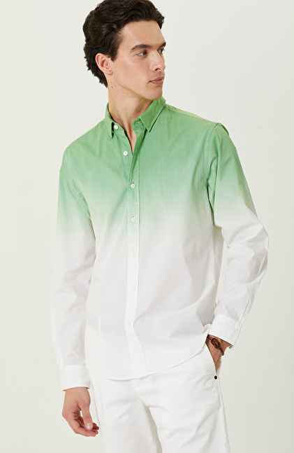 2023 yaz koleksiyonunun dikkat çekici parçaları arasında bulunan yeşil uzun kollu gömlek, Beach Wear stiliyle öne çıkar. NetWork Casual çizgisinde olduğu için oldukça rahat bir yapıya sahiptir. Hafif, kaliteli ve rahat kumaşıyla sıcak yaz günlerinde istediğiniz şıklığı yakalamanıza imkan tanır. Degrade deseniyle cesur parçalar kullanmaktan çekinmeyen erkeklere hitap eder. Tamamen pamuklu olan yüksek kaliteli kumaşı ve ütü gerektirmeyen Non Iron teknolojisiyle tatillerde bile şehirli tarzınızı göstermenize yardımcı olur. Gömlek, alt bölümüne doğru beyaz tonlara büründüğü için beyaz şortlarla eşsiz bir uyum yakalar. Ayrıca siyah bir kemer ve beyaz spor ayakkabılarla iddialı bir kombin oluşturabilirsiniz.
