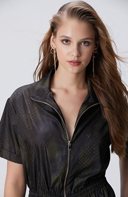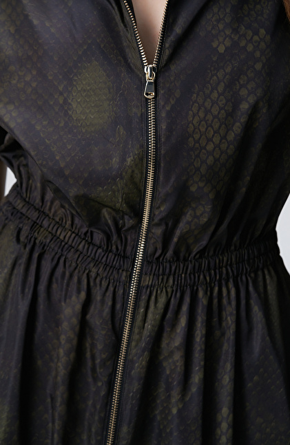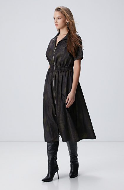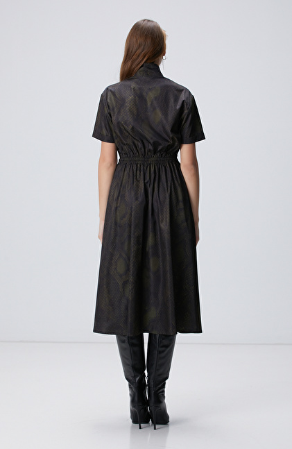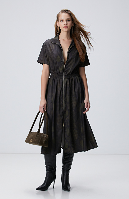 Yılan Derisi Desenli Haki Midi Elbise